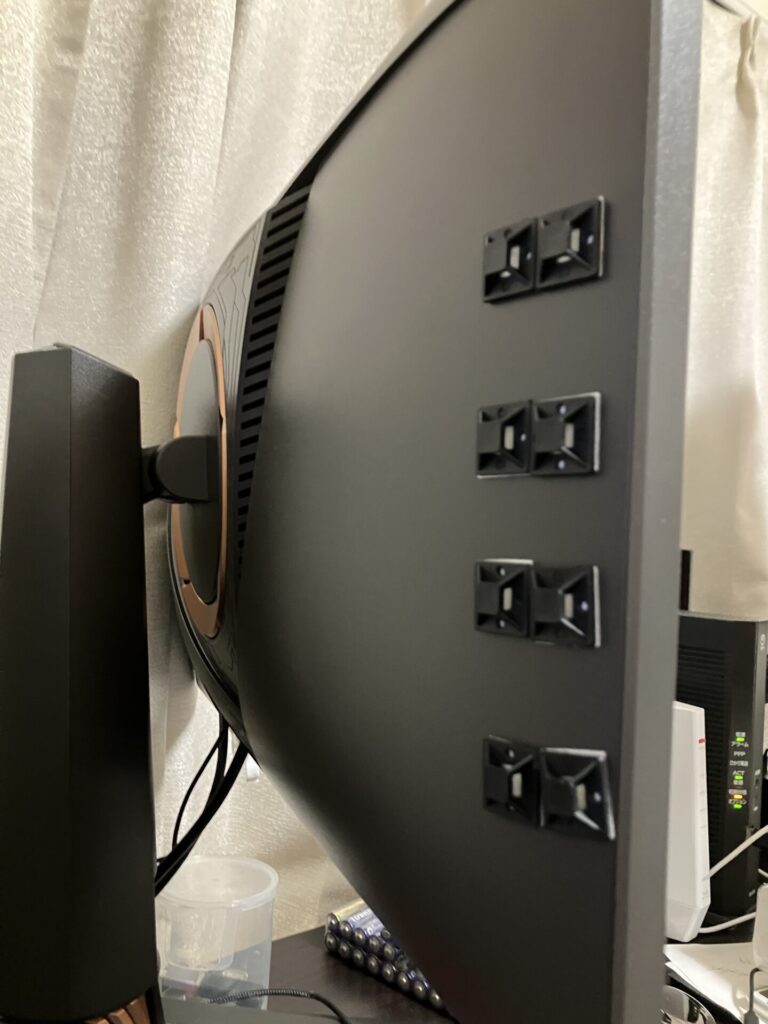 タイマウントをディスプレイの裏に貼り付けて放置(両面テープは貼り付けてから1日くらい放置すると粘着強度が増すらしい、本当かどうかは知りませんw)。