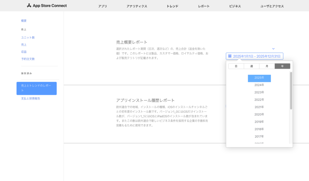 - 「概要」レポート(Summary Reports)で、レポートタイプを「年次」に設定してダウンロード。