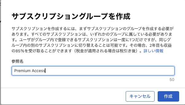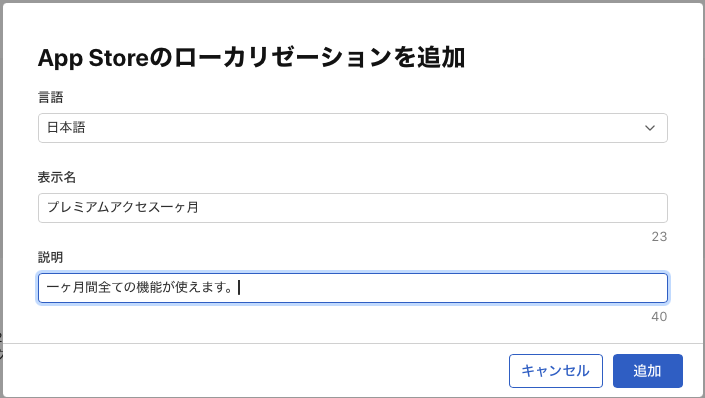 ・個別のサブスクリプションを設定する、サブスク期間が違う場合は一つずつ設定する。(ローカリゼーション以外はユーザーには表示されない、自分で使う参照名)